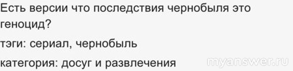 Также существует, гм, версия, что вопрос не имеет никакого отношения к сериалу, а затрагивает настоящую катастрофу на Чернобыльской АЭС и её последствия. Тогда возникает встречный вопрос об оформлении (п. 7.6 правил БВ) и введении читателей в заблуждение (п. 9.5 правил БВ), и ещё один, приведённый выше - насчёт намерения и уничтожения некоей группы лиц по признаку (не)соответствия её какому-то критерию.