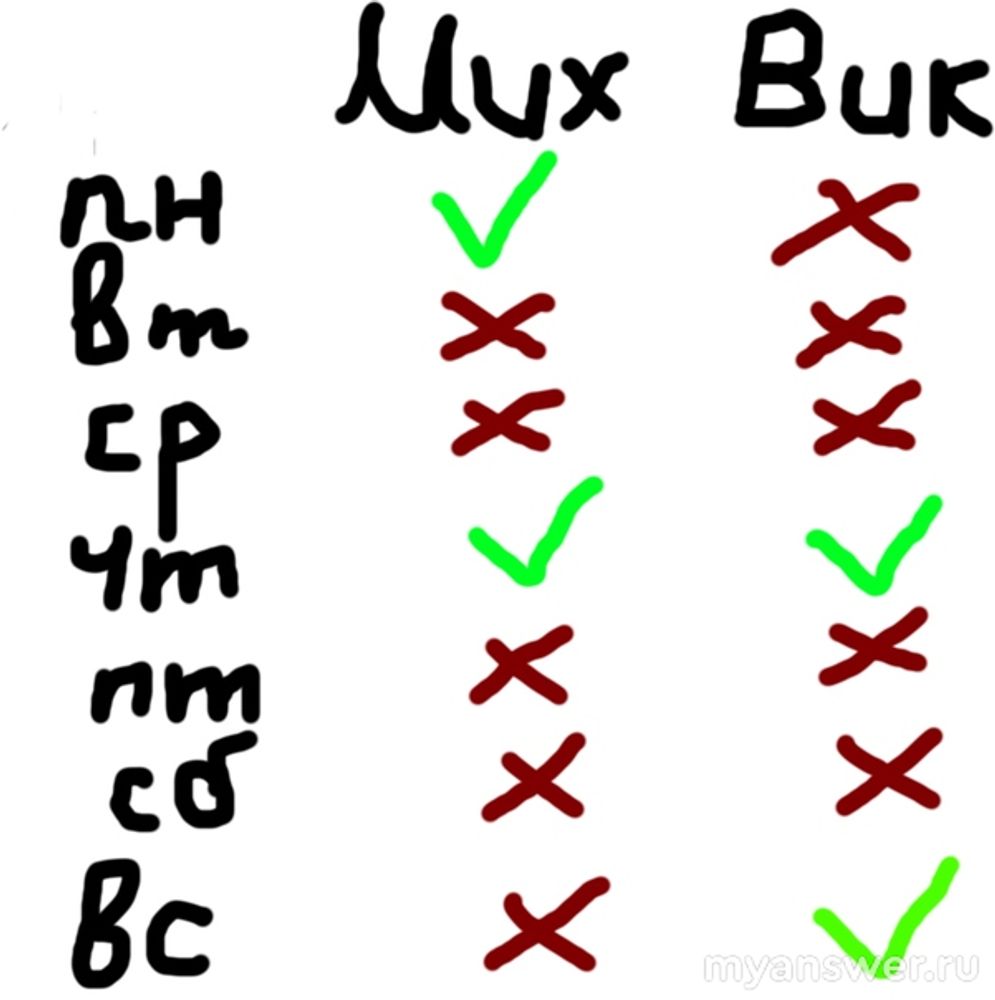 Я не поленился и решил для данной задачи сделать полный анализ. Я думаю, в данном случае будет нелишним составить таблицу (если хотите, можете назвать её матрицей) 7x2. Строки — это дни недели, а столбцы — это наши странные друзья-приятели Ивана: Михаил и Виктор.