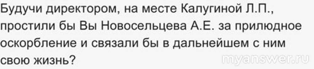 Будучи директором, на месте Калугиной Л.П., простили бы Вы Новосельцева А.Е. за прилюдное оскорбление и связали бы в дальнейшем с ним свою жизнь?