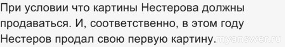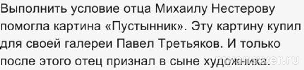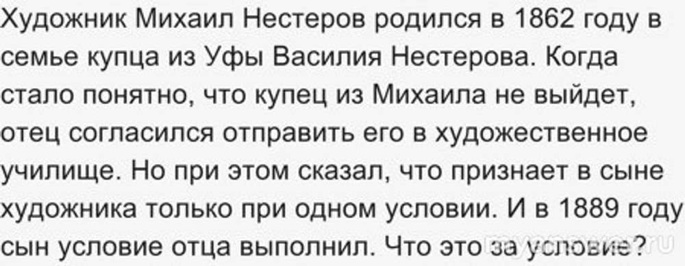 Отец Михаила Нестерова мечтал чтобы сын продолжил семейный бизнес. А сынок хотел рисовать. Родственники спорили и в пылу спора отец однажды сказал, что он признает сына художником если.. . Знатокам и надо было озвучить при каком условии отец признавал сына художником. Отвечал на вопрос Михаил Мун. Он ответил, что при условии проданной, картины. Но это примитивный ответ