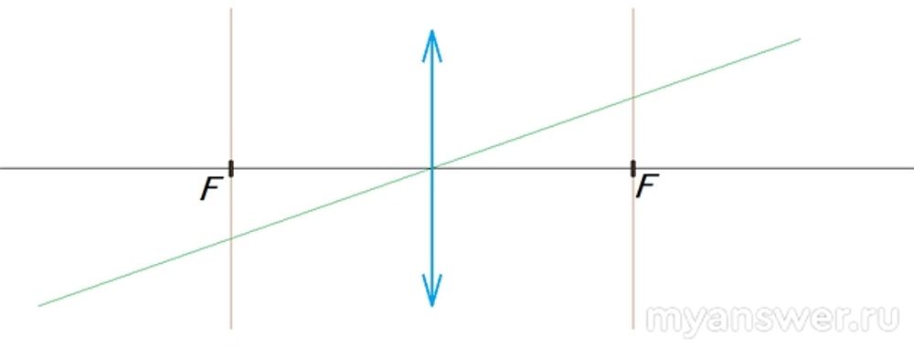 И принцип решения всех задачек на построение изображения заключается в том, что луч света, параллельный главной оптической оси, после линзы проходит через точку фокуса, а луч, проходящий через центр линзы, проходит без отклонения. Вот исходя из этого, и строится оптическая схема и/или изображение предмета. Важно лишь помнить, что изображение точки всегда находится на пересечении двух лучей. Вот пример: