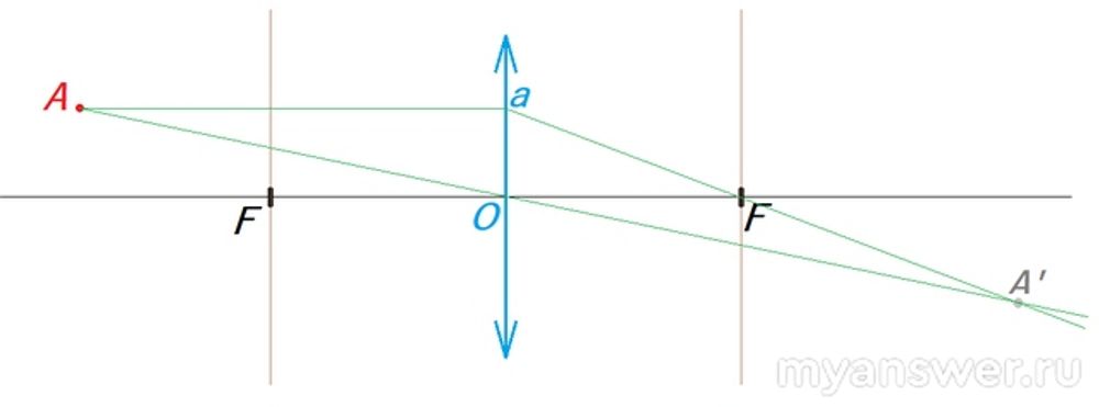 Ну и видно, что, как и написано, один луч проходит как шёл, то есть по прямой (луч АОА'), а второй, который параллелен главной оптической оси, потом проходит через фокус (луч AaFA'). И вот точка их пересечения A' и есть изображение исходной точки.