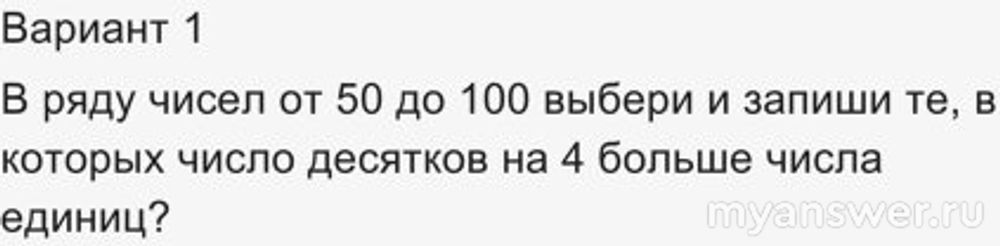 В ряду чисел от 50 до 100 выбери и запиши те, в которых число десятков на 4 больше числа единиц?