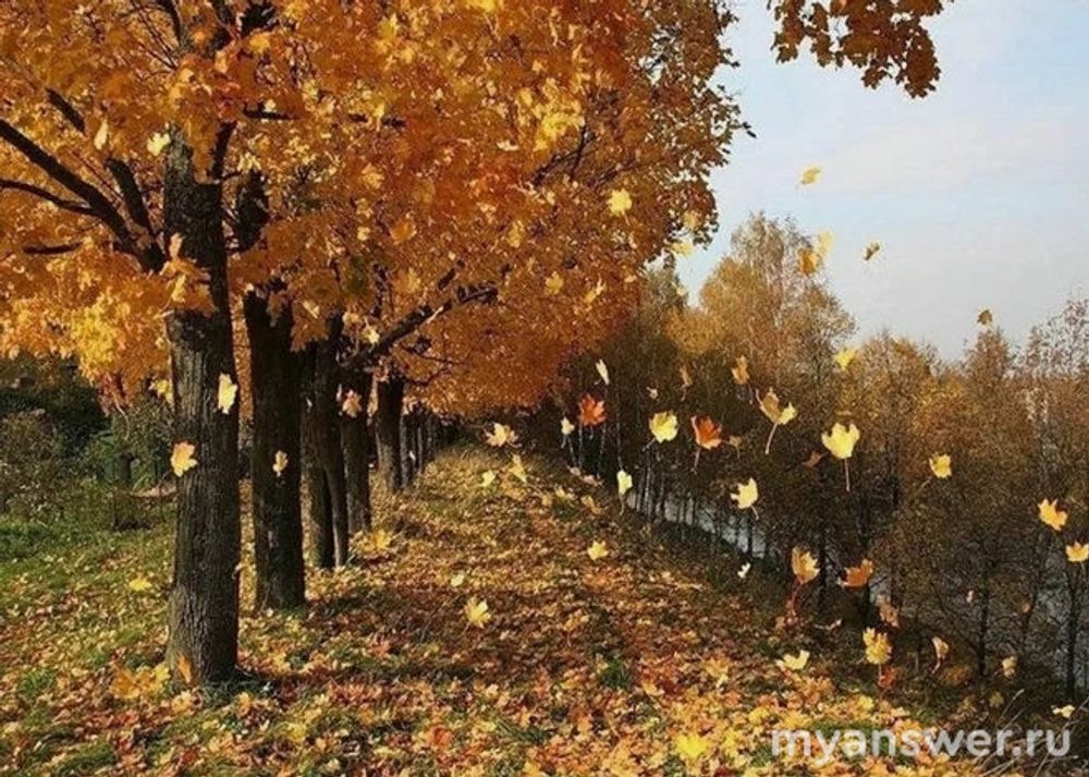 Зелёные ели взмывают в голубые небеса, клёны покрыты пурпурными листьями, а березы золотой листвой.