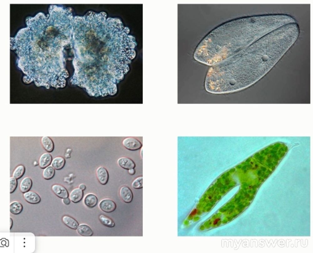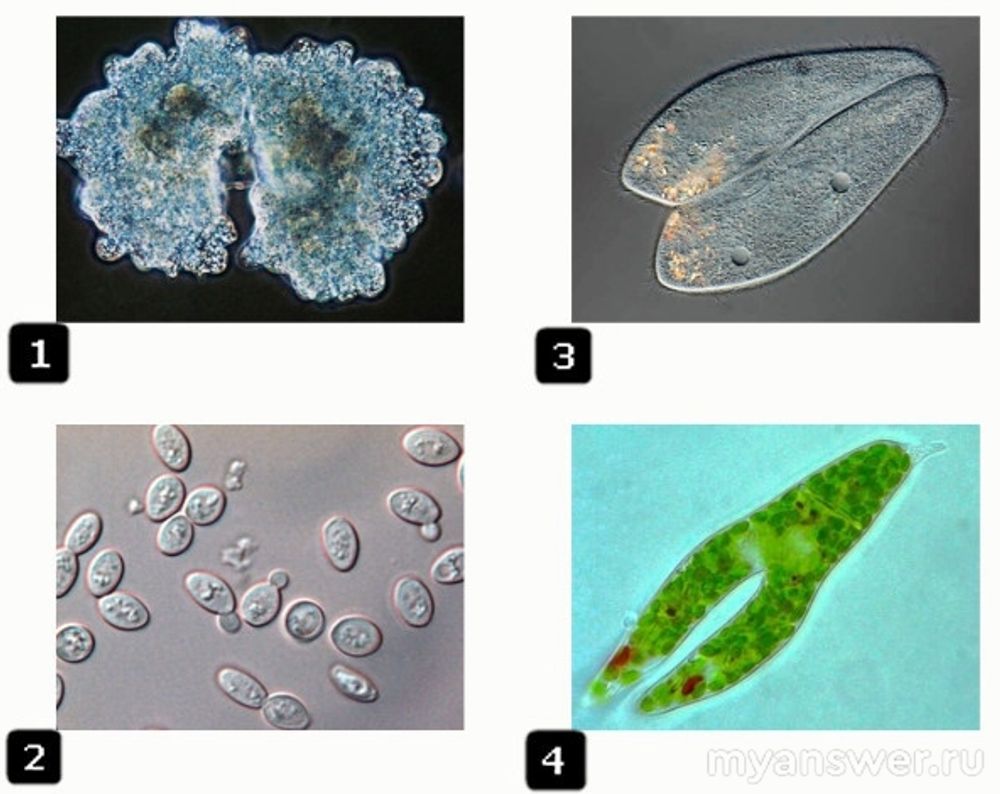Рассмотрим микрофотографии, которые нам даны в задании. Их всего четыре и нужно выбрать номер той микрофотографии, где не запечатлён процесс деления клетки. Рассмотрим сначала верхние микрофотографии : первую и третью. Из школьной программы мне известно, что на первой микрофотографии запечатлён процесс деления клетки амёбы. На третей микрофотографии мы наблюдаем процесс деления клетки инфузории-туфельки. Теперь перейдём к рассмотрению нижнего ряда микрофотографий. Тут находятся микрофотографии под номером 2 и под номером 4. Мне знакома клетка на микрофотографии под номером 4 - это деление клетки клетки эвглены зелёной. Осталась у нас только микрофотография под номером 2, на которой изображены клетки грибов, а точнее это: