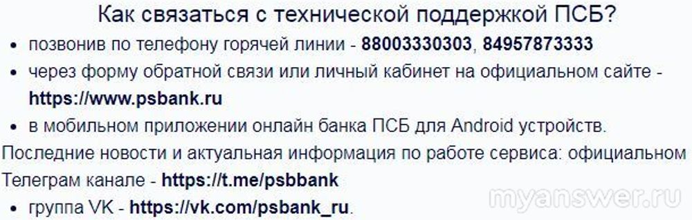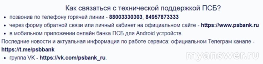 Также ниже можно увидеть номера и адреса банка для связи с технической поддержкой Промсвязьбанк: