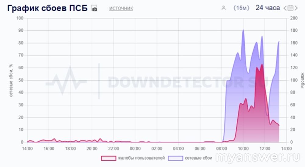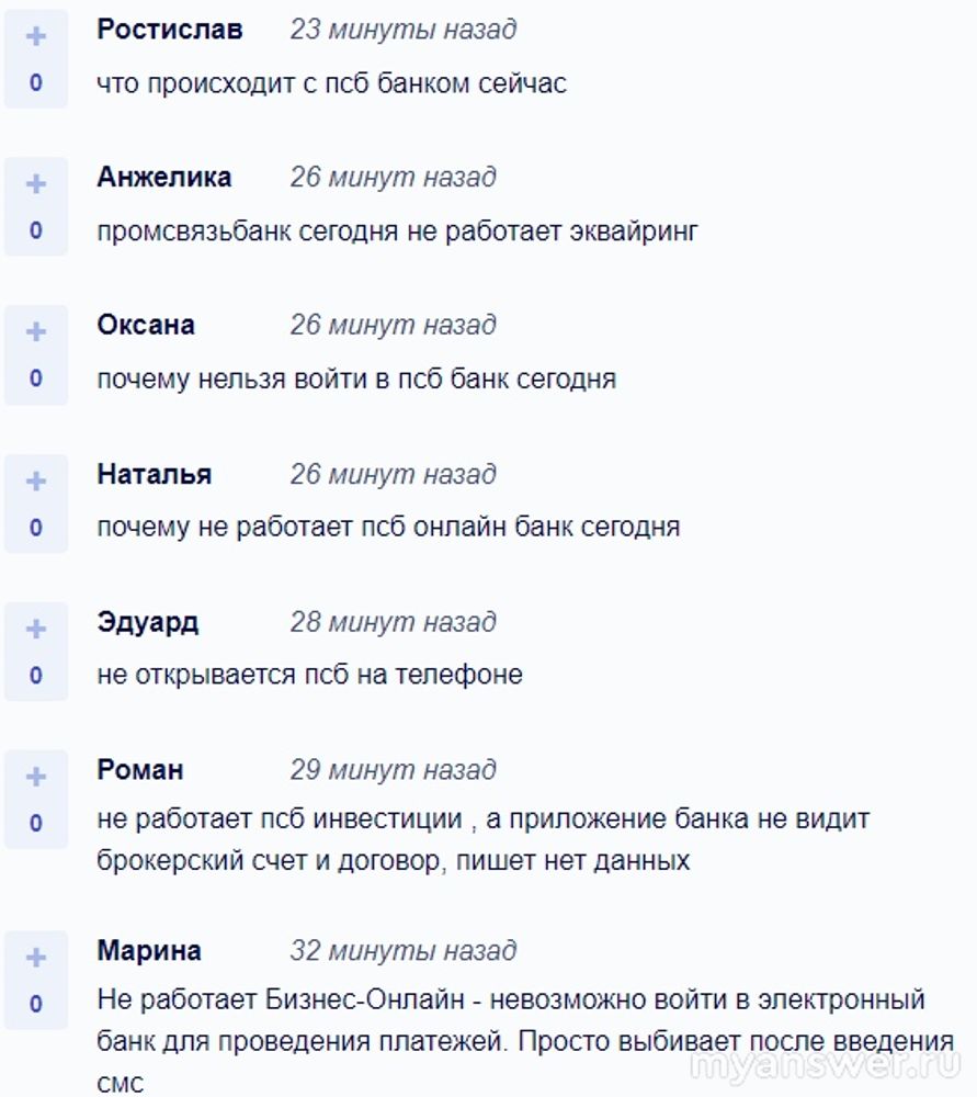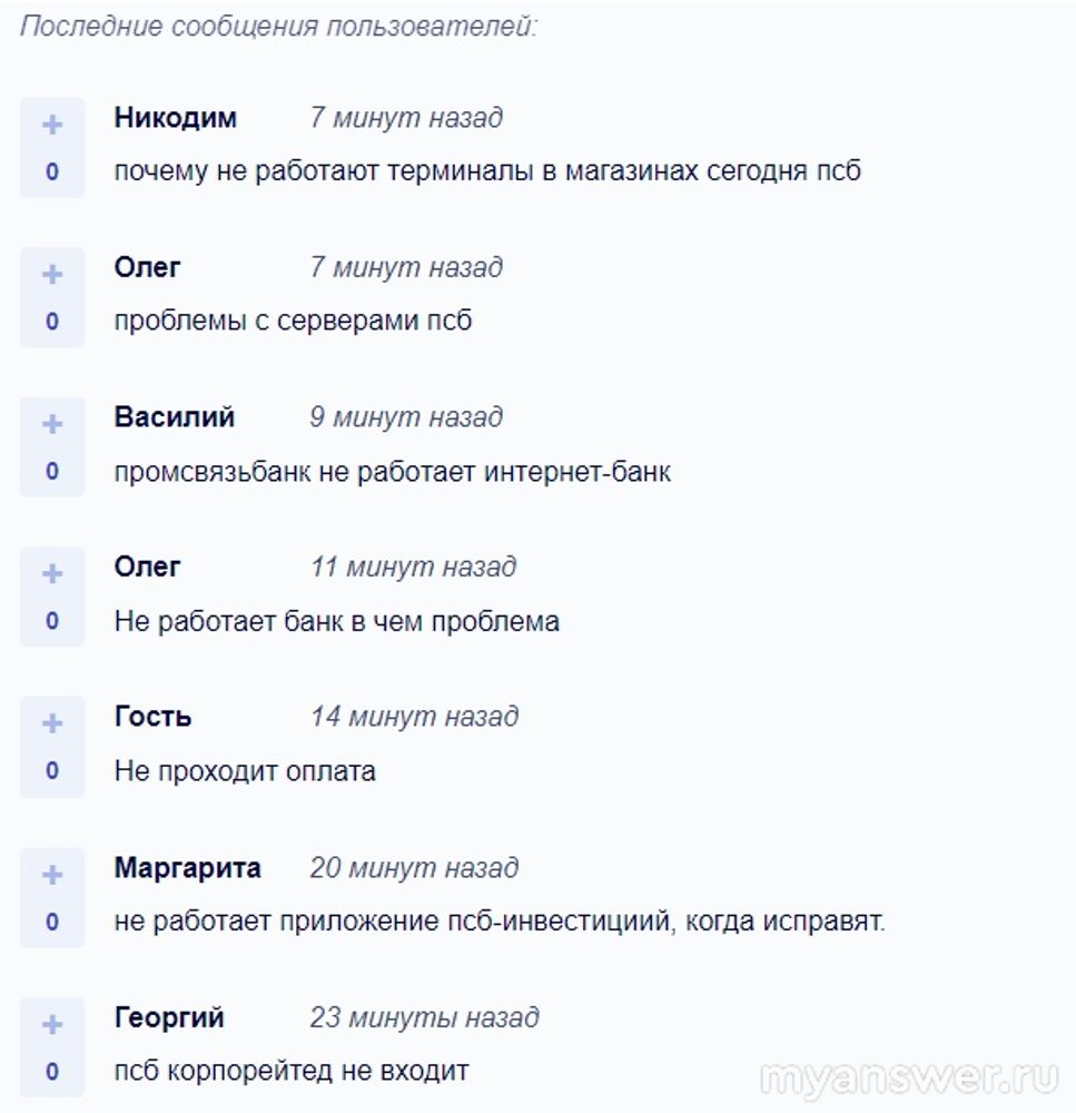 Все тут стандартно, сначала (синий фон) пошел сетевой по ПСБ сбой, а затем, поскольку проблемы пошли, начали появляться жалобы. Сетевые проблемы довольно приличные, но есть уже тендениция к их купированию, банк ПСБ все же не провайдер какой-нибудь местный, видимо, есть там все же специалисты, способные проблемы убрать. Думаю, что наладится, если только это не пролонгированная DDOS-атака, тут похуже, но ясно будет скоро. Ждать предполагается, если у кого не работает сервис или приложение ПСБ, если жаловаться, то сюда можно, у техподдержки ПСБ такие во есть контакты: