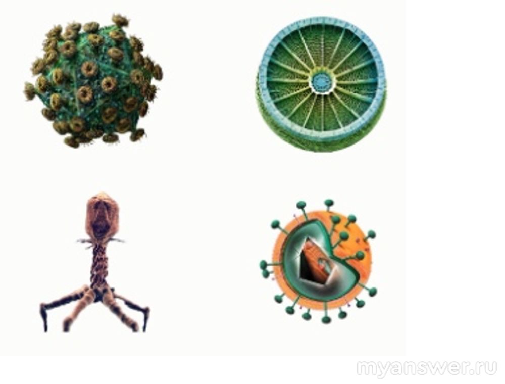 А вот нижний левый ну совсем на вирус не похож, сейчас, мы узнаем кто (что) это. Я бы выбирала между ним и верхним правым. Итак, верхний правый это диатомовая водоросль, это не вирус и это правильный ответ. А вот нижний левый это бактериофаг, который вирусом как раз является. Это очень интересный вирус бактерий, который вредит только бактериям, а человека наоборот лечит, используется в медицине.