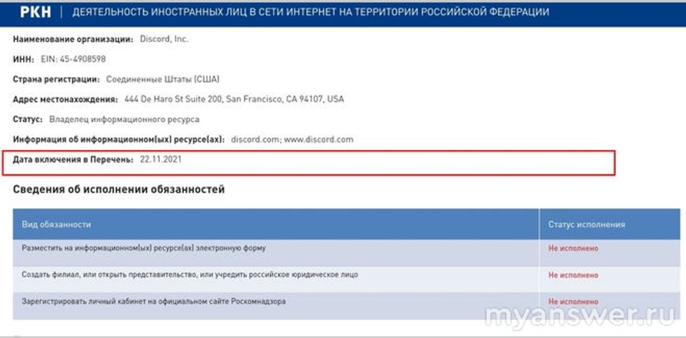 Так вот, ни к 1 января 2022, ни до сих пор, к октябрю 2024, Discord Inc. так и не раскачалась открыть офис в РФ, зарегать личный кабинет на сайте РКН и создать форму обратной связи для пользователей из России. Неужели это сверхсложная задача, нерешаемая без привлечения каких-то запредельных ресурсов? Что такого категорически невозможно в этом для корпорации, в продукции которой так заинтересованы пользователи всего мира?