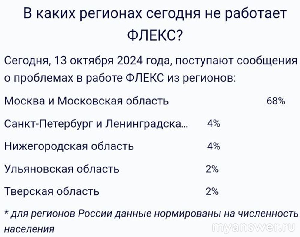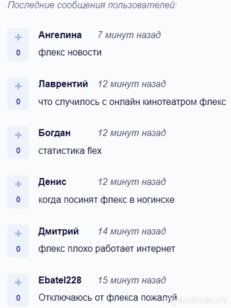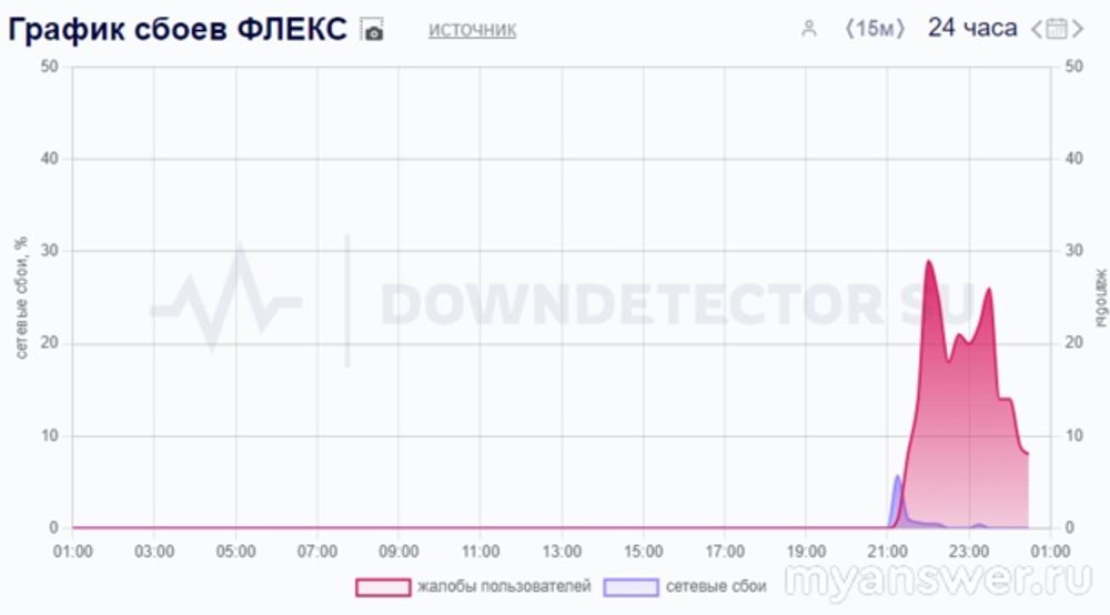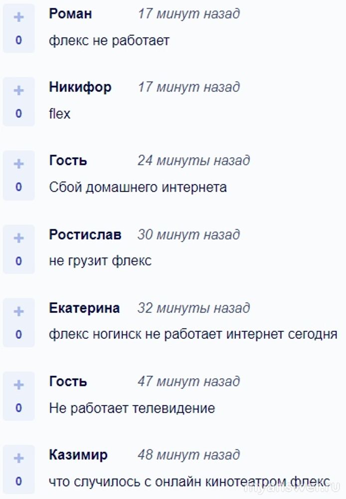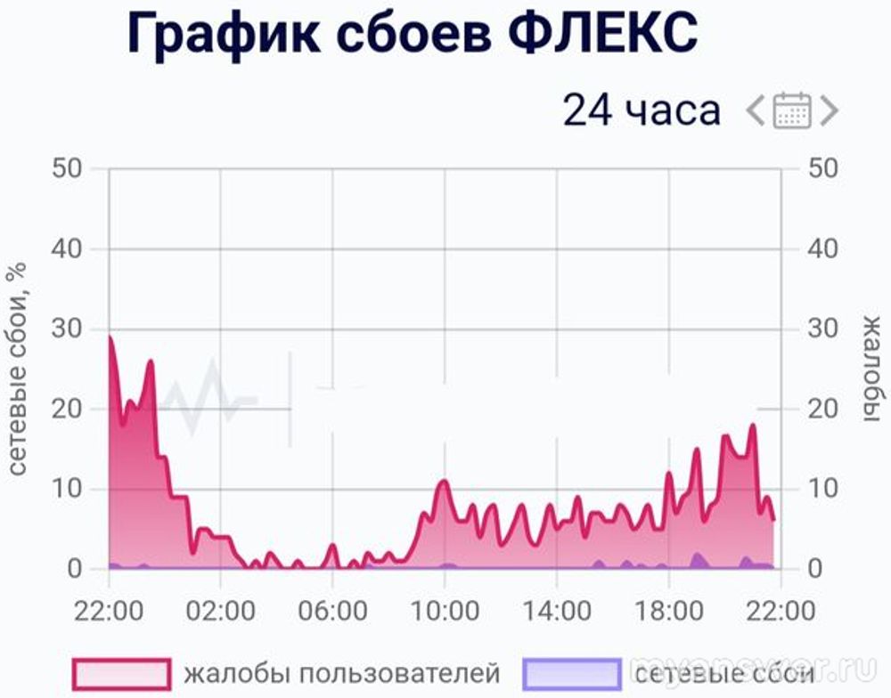 Интернет провайдер "Флекс" не работает 13 октября 2024 года в некоторых российских регионах. На графике мониторинга проверки провайдера видно, как ещё вчера 12 октября, приблизительно 21.30 вечера (по-московскому времени) произошёл сетевой сбой (синим цветом бугорок), а сейчас продолжают поступать жалобы от пользователей, в большинстве случаев из Москвы и Московской области. В ряде других регионов тоже - Ульяновск, Тверь, Нижний Новгород. Перестал работать домашний интернет, и онлайн кинотеатр Флекса.