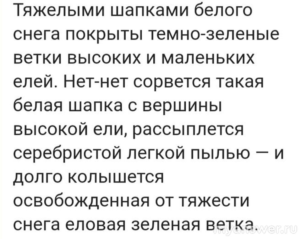 Начало повествования соответствует зиме. Автор акцентирует внимание на тишине и монументальности, царящих в лесу. На первый взгляд, жизнь замерла под слоем снега: