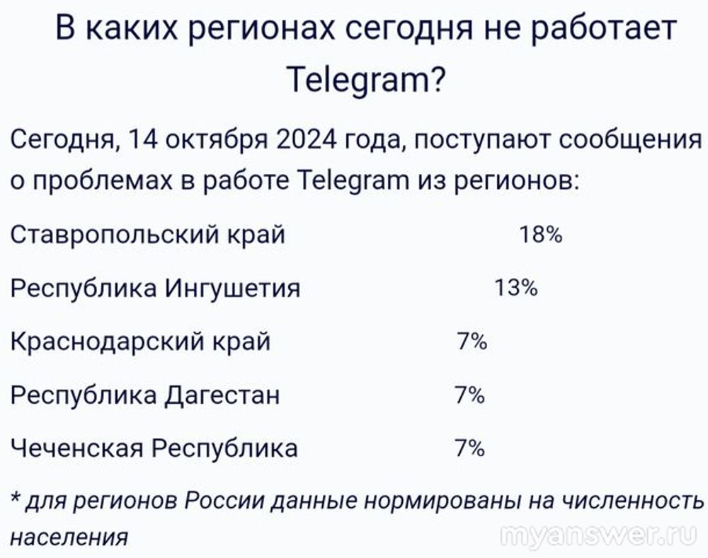 НЕ работает Телеграм с 10 октября 2024 примерно с 16:00, регион - Республика Дагестан. "Нет соединения". Через VPN - доступно. Но разве в нашей стране разрешено пользоваться VPN? и почему такое происходит? ведь на территории РФ не собирались блокировать Телеграм.