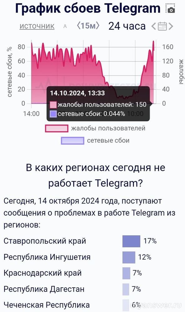 Сегодня, 14 октября 2024 года не работает или периодически сбой в работе Telegram не повсеместно, а в отдельных регионах.