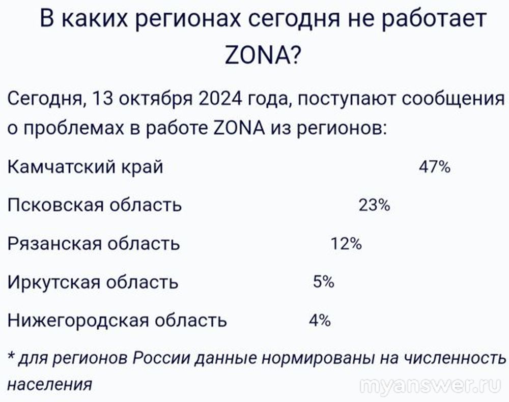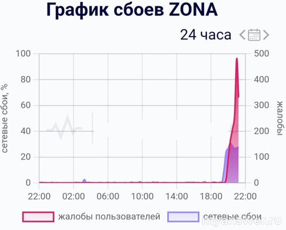В промежутке с 19 до 20 часов вечера по московскому времени 13 октября 2024 года платформа "ZONA" испытала сильнейший технический сбой, в результате которого резко возросли жалобы на работу. В комментариях пишут, что не открывается приложение, не воспроизводится видео, невозможно войти в личный кабинет.