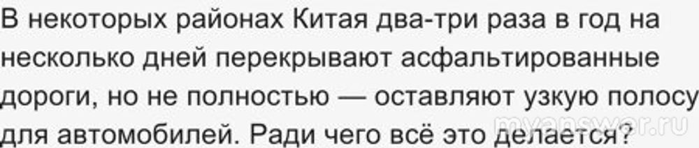 Вопрос о перекрытии дорог был задан первым во второй игре осенней серии . Играла команда Элькиса. Отвечала Кристина Заляускайте. Кристина биолог и ей близки животные. Она предположила, что дороги перекрывают для того , чтобы обеспечить безопасный переход животных через дороги. Гуманная версия. Но она не объясняет почему это происходит 2-3 раза в год. А правильный ответ на вопрос другой. Китай южная страна. И урожай риса, кукурузы собирают 2-3 раза в год. Рис -важный продукт в рационе китайцев. На жарком асфальте дорог рис хорошо сохнет. А когда рис сохнет дороги и перекрывают, оставляя узкий проезд. Эту картину видел своими глазами Михаил Мун. Ответ: Фермеры используют асфальтовые дороги для сушки риса и кукурузы