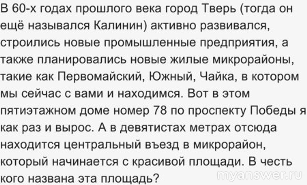 В 60-х годах прошлого века город Тверь (тогда он ещё назывался Калинин) активно развивался, строились новые промышленные предприятия, а также планировались новые жилые микрорайоны, такие как Первомайский, Южный, Чайка, в котором мы сейчас с вами и находимся. Вот в этом пятиэтажном доме номер 78 по проспекту Победы я как раз и вырос. А в девятистах метрах отсюда находится центральный въезд в микрорайон, который начинается с красивой площади. В честь кого названа эта площадь?