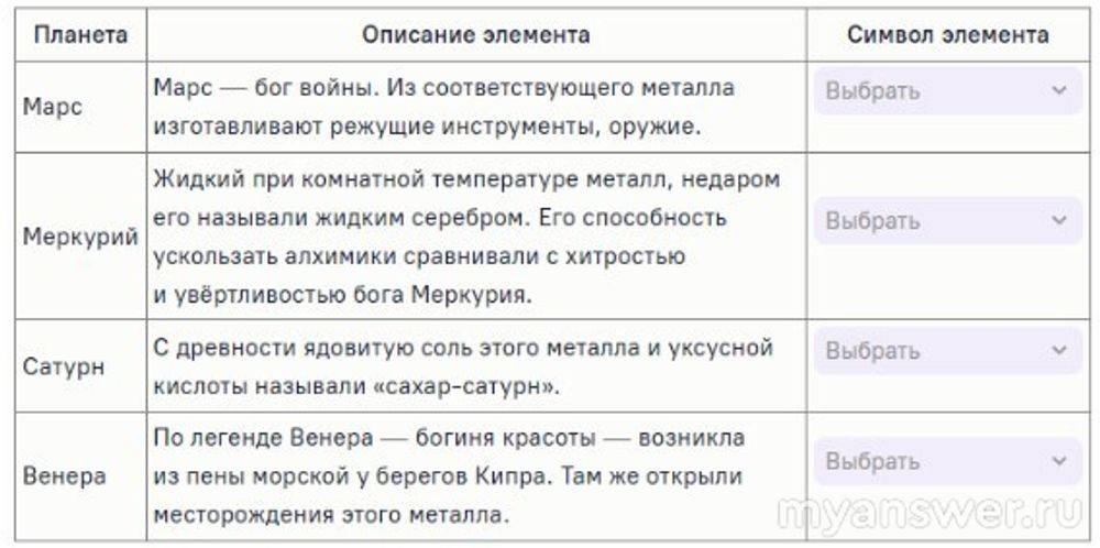 Окончательные ответы: Марс — Fe, Меркурий — Hg, Сатурн — Pb, Венера — Cu.