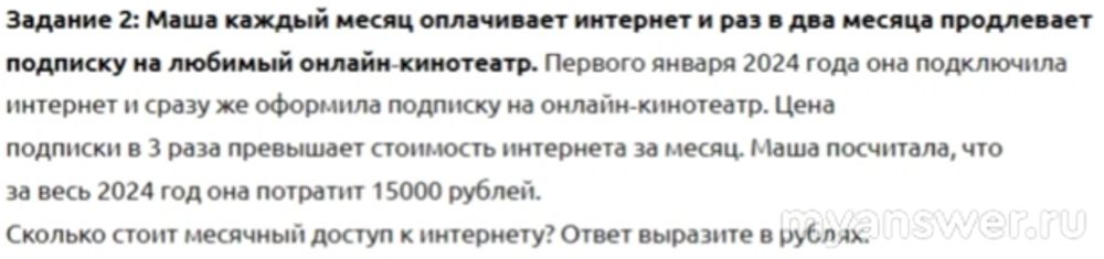 Получается, что за месяц на интернет Маша тратит 500 рублей. Мы знаем, что подписка онлайн-кинотеатра ей в 3 раза дороже обходится. Следовательно, 500*3=1500 рублей. Верный ответ: 500 и 1500 рублей.