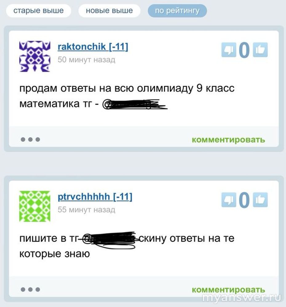 В последнее время под вопросами, связанными с олимпиадами и другими похожими работами стали появляться боты с ответами по типу: вот мой телеграмм, напиши мне, заплати и ответы твои.