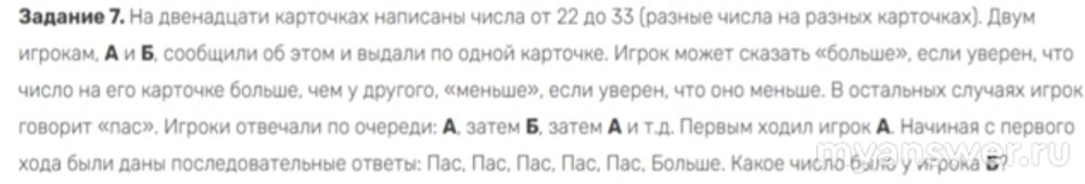 Математическая задача была предложена для решения учащимся девятых классов во время олимпиады. Из ее условия нам известно, что количество карточек было двенадцать, что числа, там написаны были от двадцати двух до тридцати трех. Игроки во время игры сообщали друг другу, от том, какие у них числа, но сами числа не называли. Они просто говорили "меньше", либо "больше", если были уверены, что число больше, либо меньше, чем у другого игрока. Пас они говорили, если не были уверенны большее число, либо меньшее. Ребятам необходимо определить число игрока Б, если известны ходы игрока А. У данного игрока было число двадцать семь. Верный ответ 27.