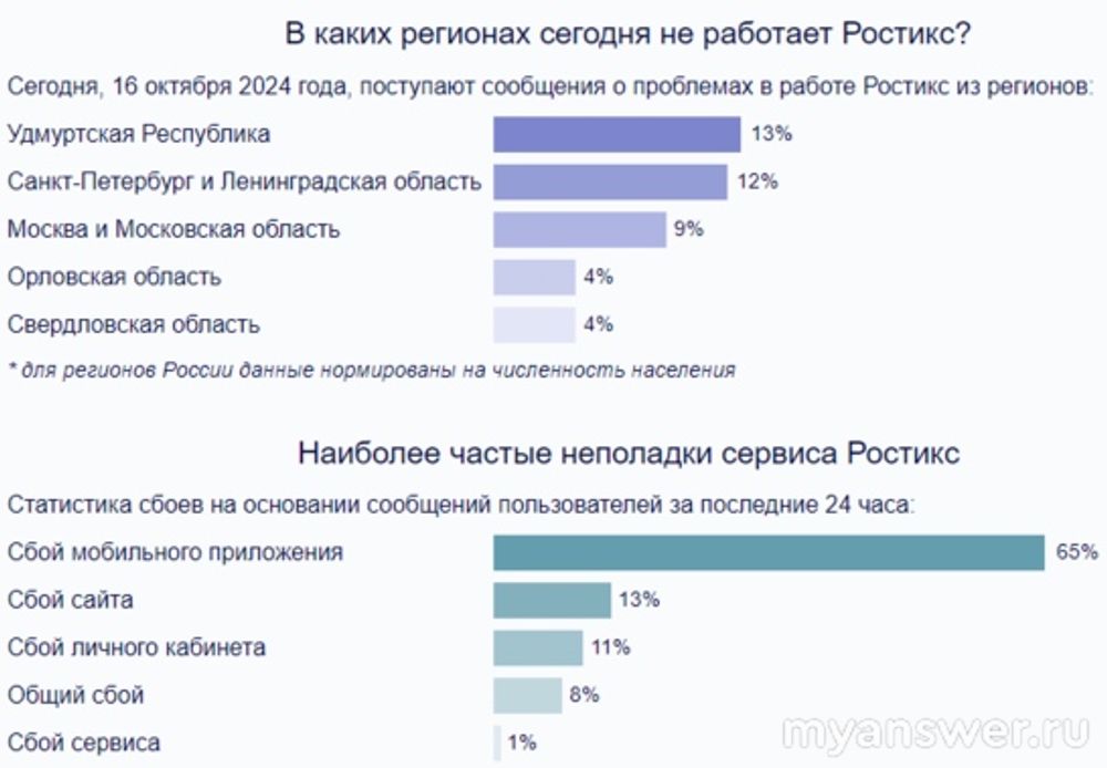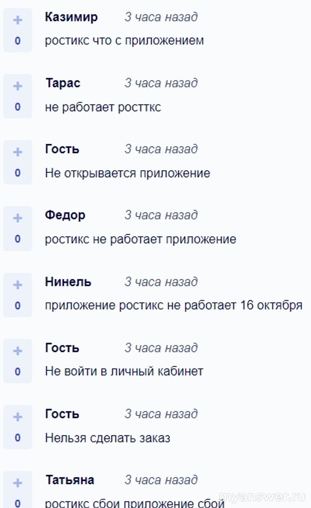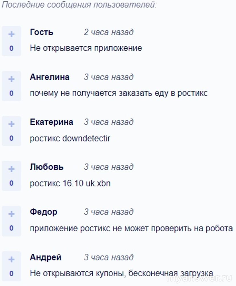 Не работает Ростикс (ресторан быстрого питания) 16 октября 2024 года в некоторых российских регионах, в основном: в Удмуртской Республике, в Санкт-Петербурге и Ленинградской области, в Москве и Московской области, Орловской м Свердловской областях. Не работает мобильное приложение Ростикс, и пользователям не сделать заказ онлайн или произвести оплату.