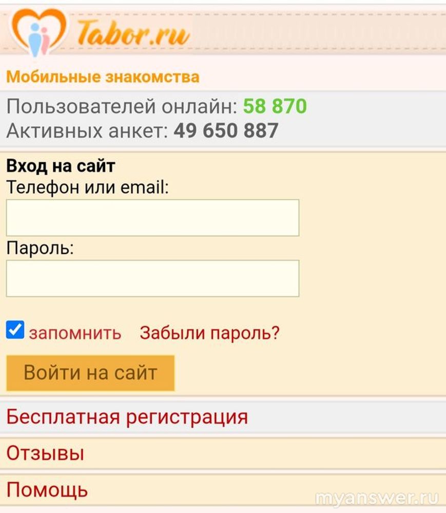 Просмотреть анкеты людей на сайте знакомств "Табор" без регистрации, можно только зайдя на него через компьютер. Если вы так сделаете и попадете на сайт, то тогда там в поиске, вам надо вбить параметры и данные, по которым вы хотите присмотреть людей и информацию вам выдадут. Ну а чтобы общаться на этом сайте с кем-то, вам придется регистрироваться. Более того, регистрироваться придется и тогда, когда вы просто захотите зайти на мобильную версию данного сайта. Регистрация же на сайте знакомств "Табор", потребует у вас наличие мобильного телефона, так как там она идет через номер телефона, но плюс хоть в том, что она бесплатная.
