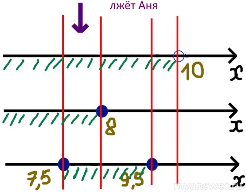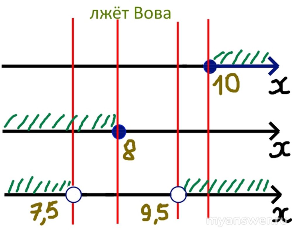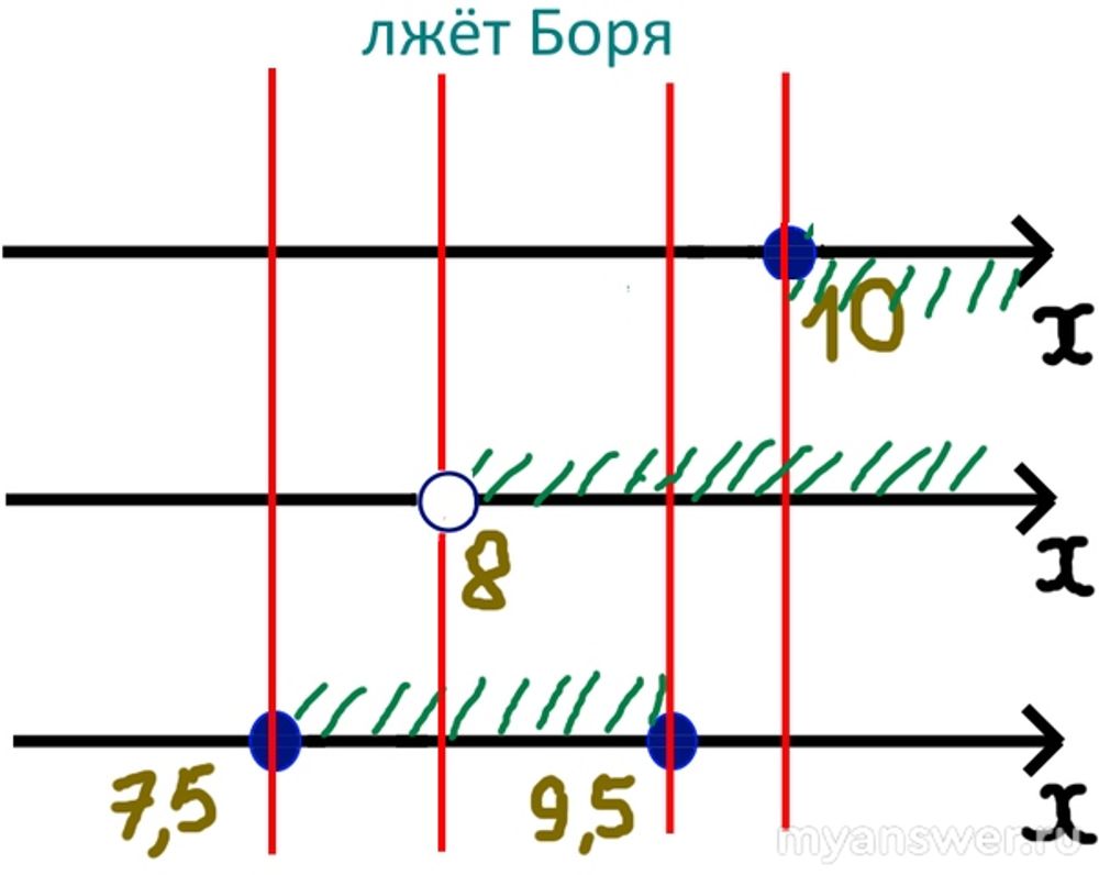 Необходимо последовательно в нашей системе вместо каждого из трёх высказываний подставить его отрицание. Два других высказывания при этом останутся неизменными. Затем мы нанесём точки 7,5; 8; 8,5; 10 на одномерную координатную ось. [Они разобьют её на пять промежутков.] Для каждого из трёх высказываний (с учётом внесённого изменения в виде отрицания) мы выполним соответствующую штриховку, выделив нужный нам промежуток на оси координат. И для каждого из трёх случаев мы должны определить, есть ли тройная штриховка. [Ибо какое-то расстояние нашим троим героям точно придётся преодолеть, это чётко установленный факт; остаётся лишь выяснить, кто соврал...] Тот случай, когда появится промежуток, заштрихованный три раза, и будет нашим искомым!