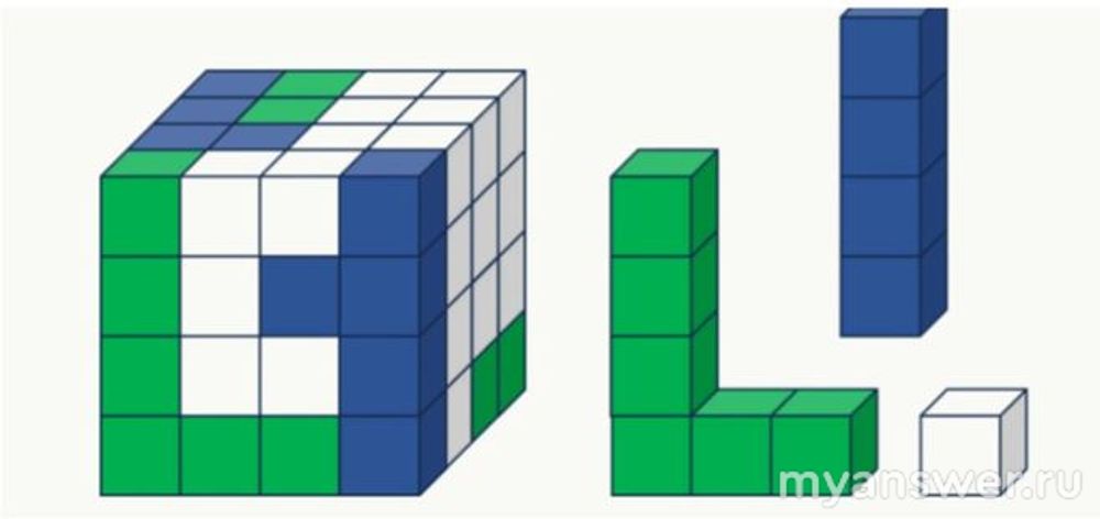 Каждый слой будем формировать, опираясь на рисунок в задаче и размеры и форму фигур, рисуя в воображении, как бы они могли располагаться, учитывая, что мы видим на трёх боковых сторонах кубика.