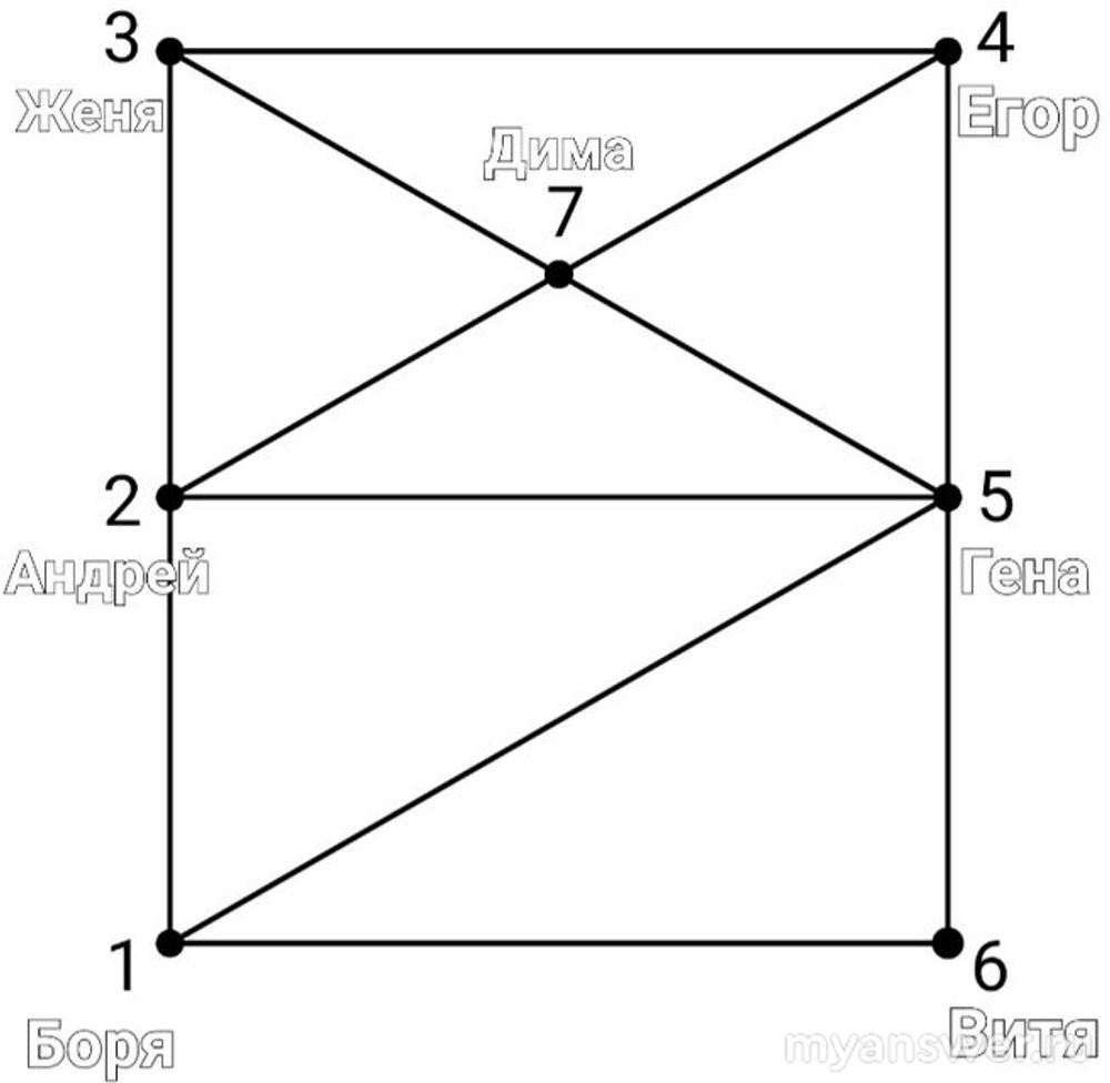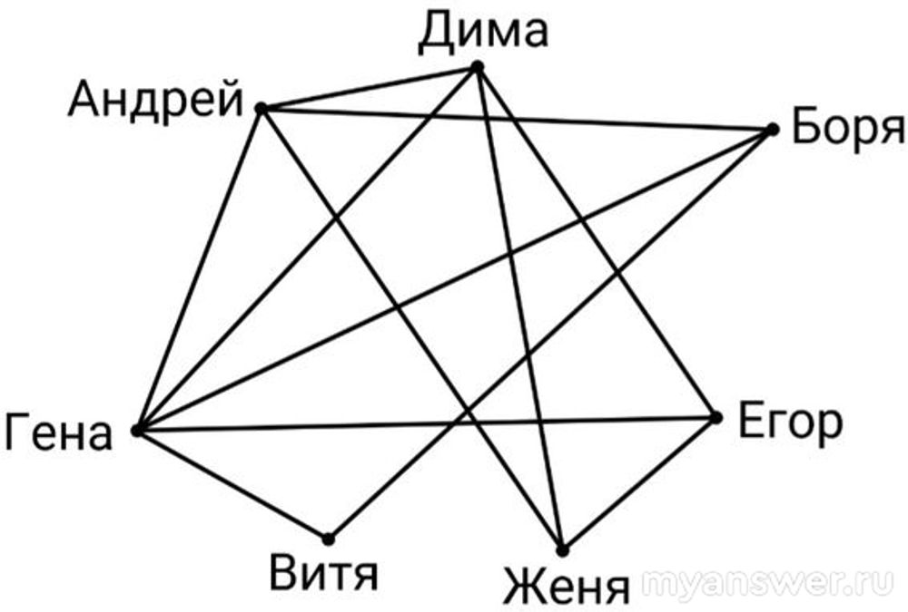 Уже сейчас на папиной схеме можно номер 5 присвоить Гене, поскольку там 5 дружеских связей, а номер 6 - Вите, поскольку там 2 дружеские связи. Это те комбинации, которые не повторяются.