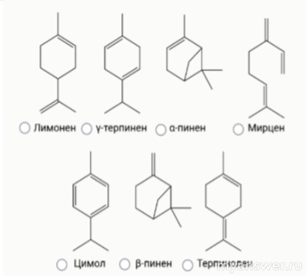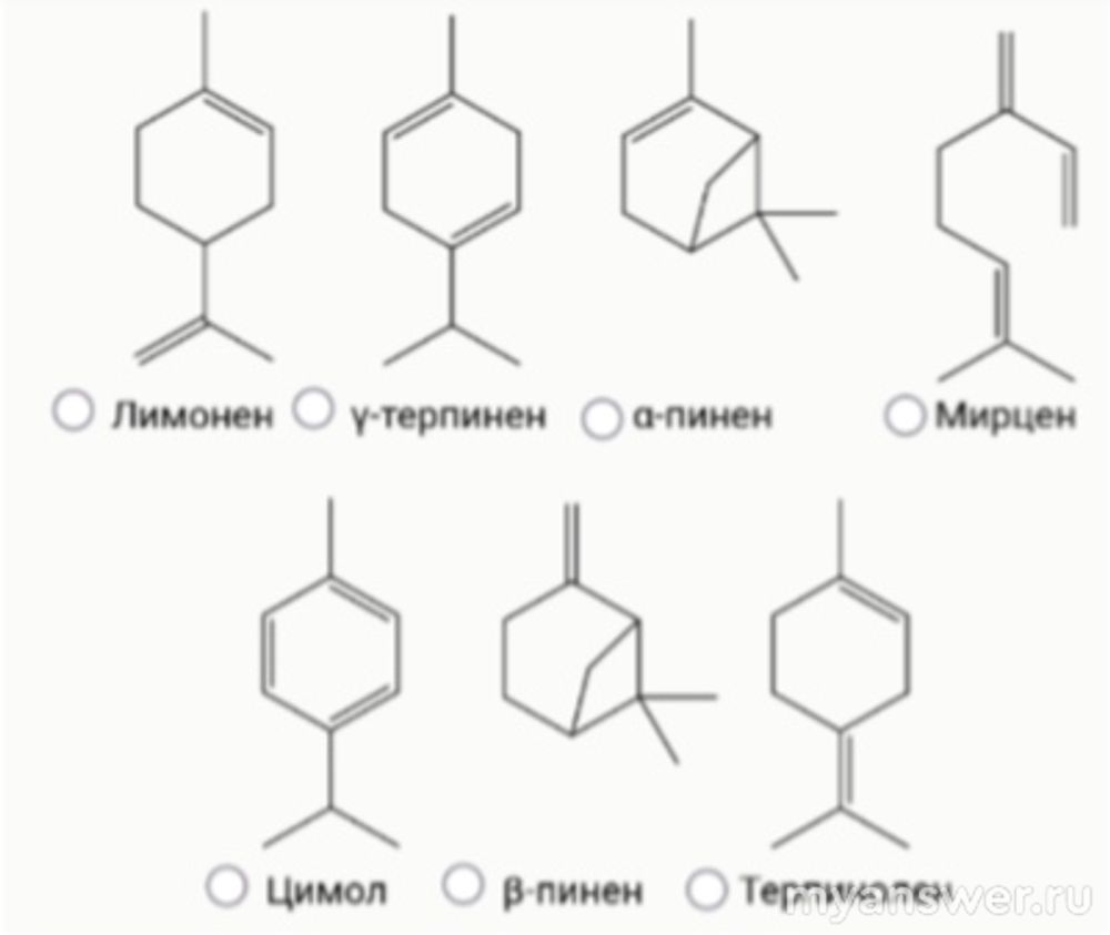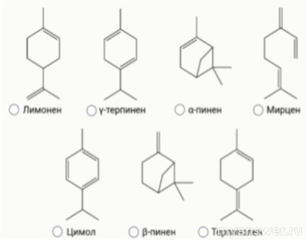 1.Из кожуры мандарина с помощью пресса можно выжать эфирное масло с сильным цитрусовым запахом, которое в основном состоит из углеводородов терпенового ряда. Выберите компонент мандаринового масла, НЕ являющийся изомером по отношению к остальным:
