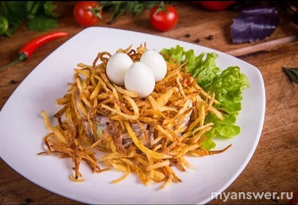 На снимке изображен салат "Гнездо глухаря".