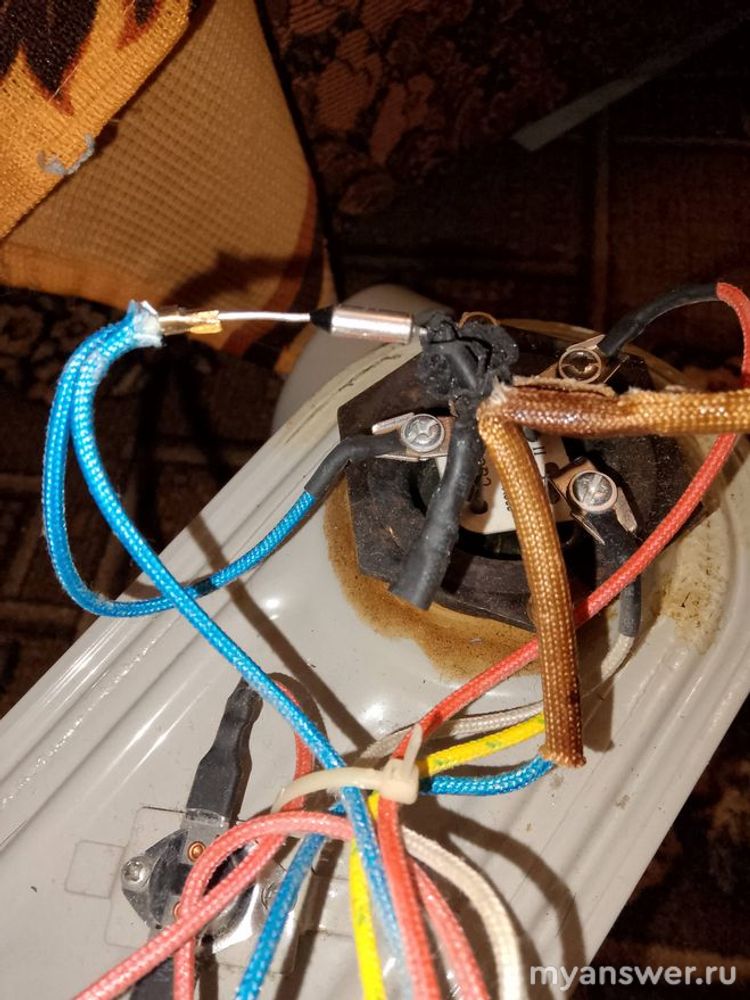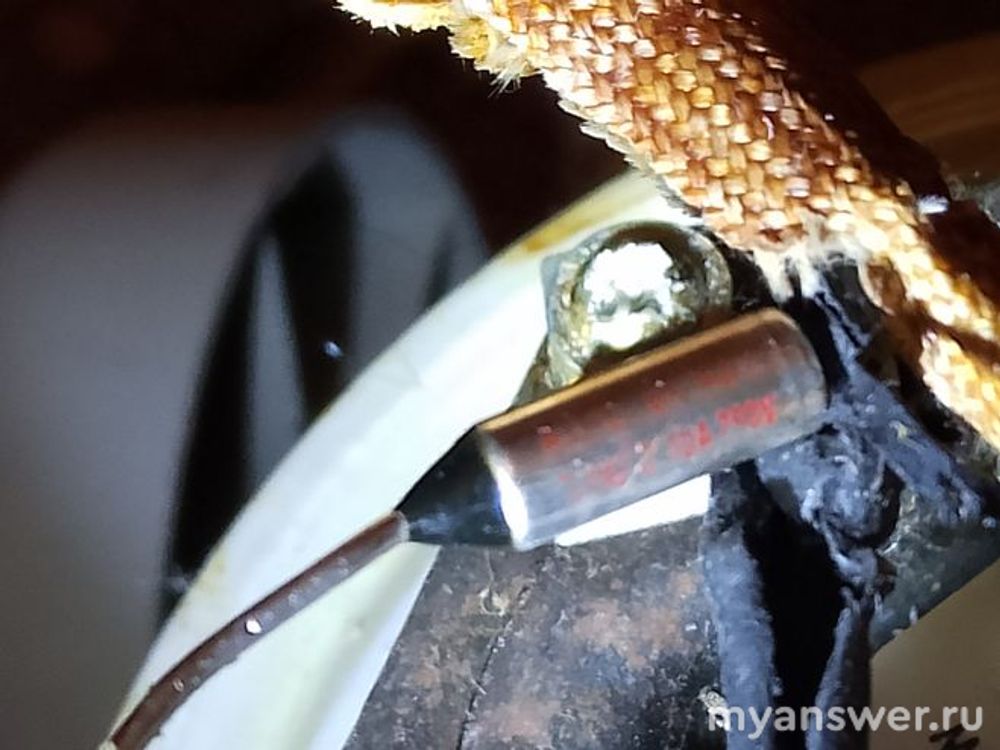 (Из-под шестигранной гайки с прикреплёнными проводами стало сочиться масло. Видимо, от этого предохранитель и сгорел.