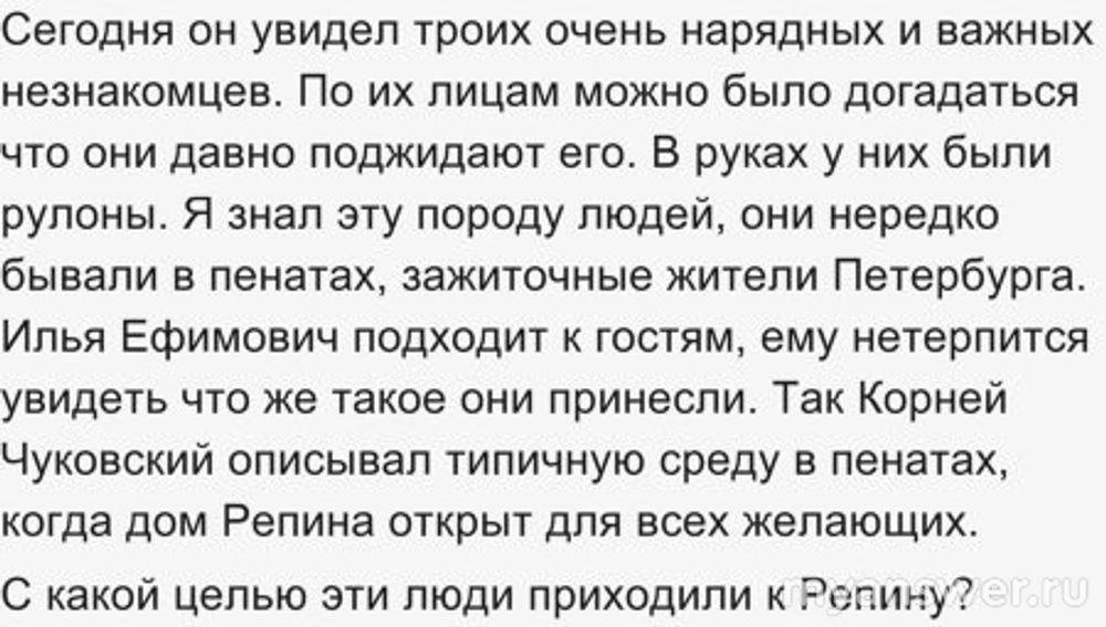 А теперь верный ответ: Картины приносили те кто хотел удостоверится в подлинности своих покупок, то есть, что бы художник Илья Репин подтвердил авторство.