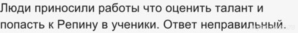 К Репину приходили по средам с рулонами в руках, чтобы убедиться в оригинальности работ художника. А знаток ответил, что для подбора у себе ученика. Вопрос был с подвохом. Но команда потом воспользовалась подсказкой и смогла отыграться.