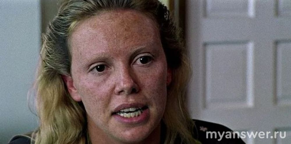 Шарлиз Террон действительно удалось погрузиться в роль Эйлин Уорнос. Зубы - это специальный гель и накладки. Профессиональный грим превратил красавицу актрису в маньяка в юбке. У самой Шарлиз очень сложная семейная история, и она в свое время рассказывала в интервью, что эта роль помогла ей в борьбе с детскими страхами и комплексами.