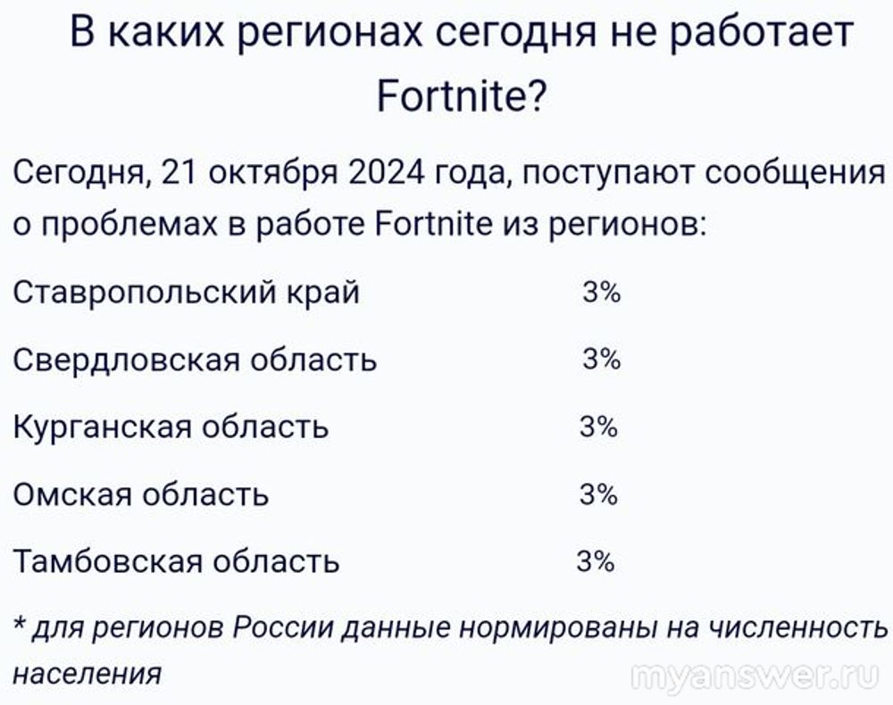 Fortnite (Фортнайт) не работает с 21 на 22 октября 2024 года во многих российских регионах. Fortnite - это онлайн-игра жанре королевской битвы.