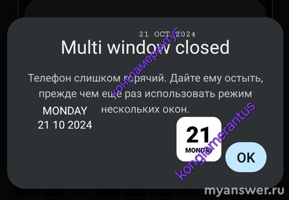 Современные Android девайсы в многооконном режиме позволяют одновременно работать сразу с несколькими окнами в режиме многозадачности, когда одновременно запущено куча приложений и можно просматривать сразу все или несколько, что изрядно подъедает его ресурсы и вызывает перегрев. О чем, собственно, он вас и предупреждает, что из-за высокой температуры многооконный режим система выключает. Если он вам особо и не нужен, то можете и сами его выключить в настройках. Или же разгрузить смартфон, "прибив" все ненужные, но работающие в данный момент фоновые приложения, для чего есть приложухи, типа Kill Apps и иже с ними, и тд. Можно просто включить режим энергосбережения, тогда девайс сам поотрубает лишние фоновые сервисы.