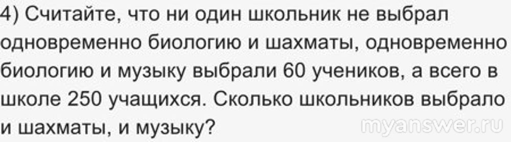 Учащиеся школы должны выбрать себе дополнительные занятия на год. Каждый из них выбрал как минимум один предмет из предложенных: биологии, музыки и шахмат. Известно, что 150 школьников выбрали биологию, 130 учеников музыку и 100 шахматы, но каждый учащийся мог выбрать и несколько предметов. Ответьте на вопросы. Если вы не можете дать ответ на какой-то вопрос, запишите в ответе любое число.