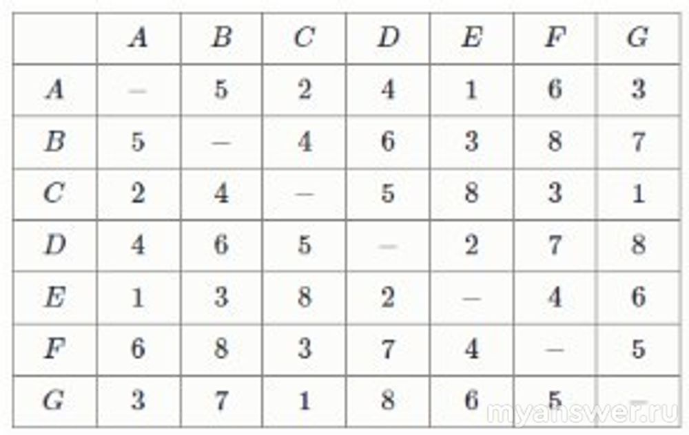 Есть 7 городов, обозначенных буквами английского алфавита А, В, С, D, Е, F, G. Вы хотите посетить эти все города ровно по одному разу каждый и вернуться в начальную точку своего путешествия. Для этого вы можете воспользоваться самолётами: между двумя любыми городами есть прямой авиарейс. Стоимость перелёта между парой городов приведена в следующей таблице.