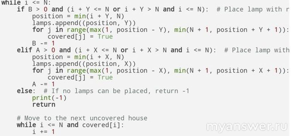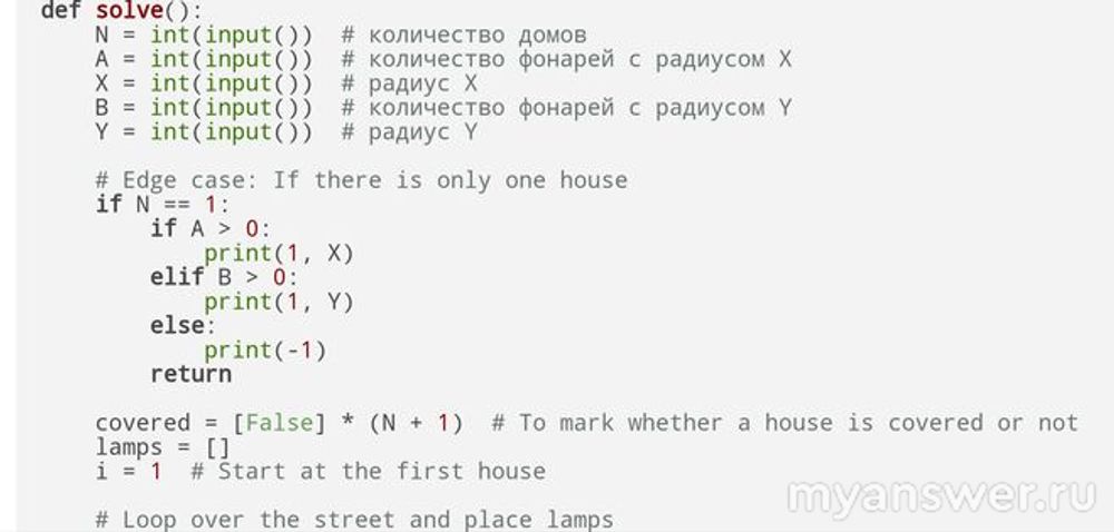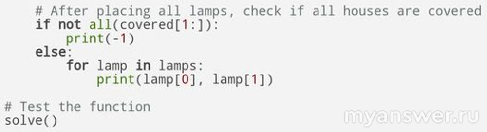 Программа должна вывести столько строк, сколько фонарей необходимо установить. Каждая строка должна содержать два целых числа через пробел координату фонаря и расстояние, которое он освещает (то есть одно из чисел X или Y ). Координаты представляют из себя целые числа от 1 до N, рядом с каждым домом можно поставить только один фонарь.
