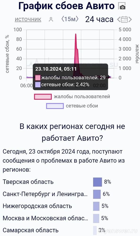 Сайт "Авито" не работает во многих российских регионах 23 октября 2024 года. Произошла серея из трёх подряд вспышек сетевой атаки (дос-атаки) 22 октября примерно в 15 часов дня и спала около 17:30 вечера (по-московскому времени) продолжая сбоить уже на более низком уровне.