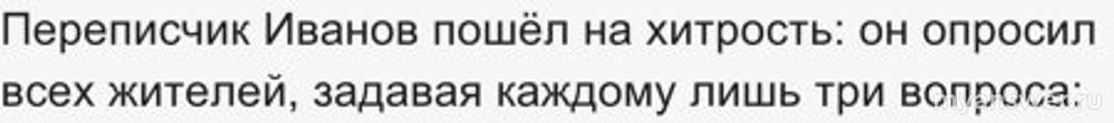 Переписчик Иванов пошёл на хитрость: он опросил всех жителей, задавая каждому лишь три вопроса: