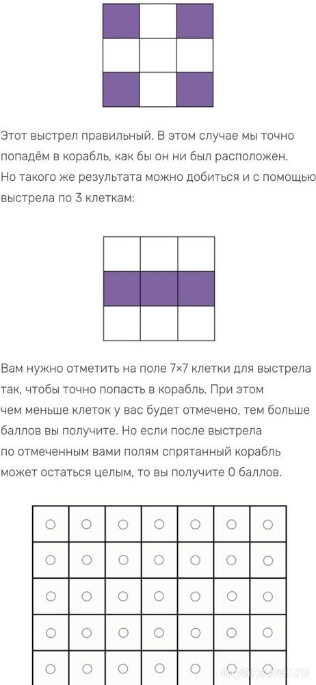 Вам нужно отметить на поле 7×7 клетки для выстрела так, чтобы точно попасть в корабль. При этом чем меньше клеток у вас будет отмечено, тем больше баллов вы получите. Но если после выстрела по отмеченным вами полям спрятанный корабль может остаться целым, то вы получите 0 баллов.