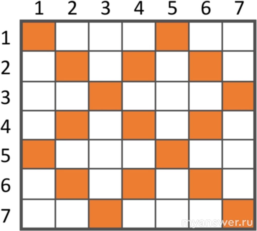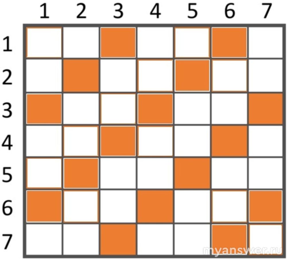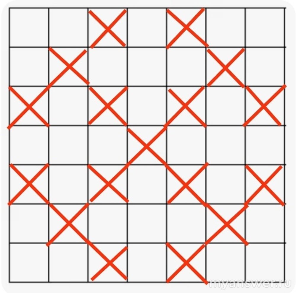 По условию задания под названием "Морской бой" нужно на поле 7 на 7 гарантированно подбить все корабли. Выражаясь терминологией морского боя все корабли противника четырёхпалубные, Г-образной формы. Нужно сделать минимальное количество выстрелов, чтобы ни одного корабля не осталось. Таких выстрелов получилось 17. Вот они все на рисунке.