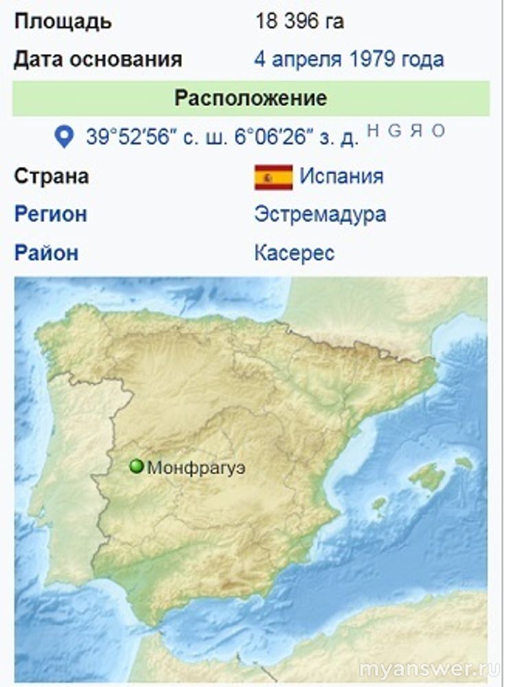 Монфрагуэ (исп. Parque Nacional de Monfragüe) расположен на западе Испании в центре географического треугольника, образованного Пласенсией, Трухильо и городом Касерес в провинции Касерес. Монфрагуэ также является графством Эстремадура без административной роли.