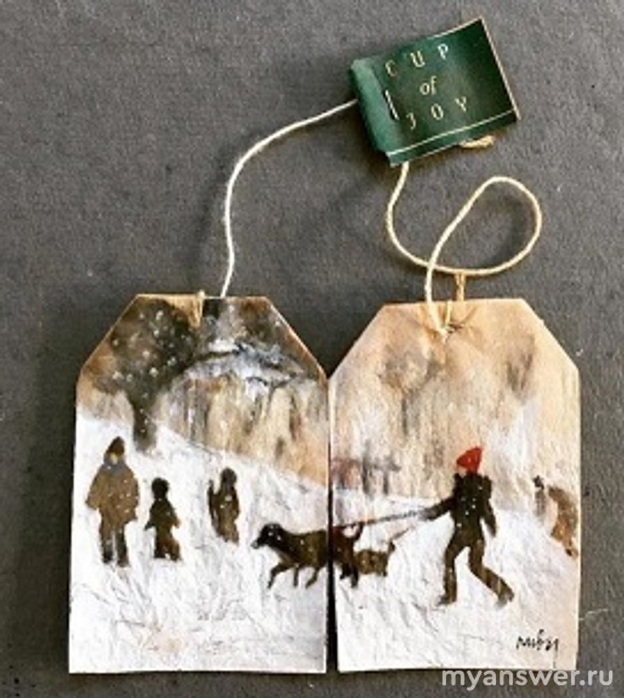 Вопрос, в очень похожей формулировке, прозвучал на игре знатоков "Что, где, когда", кажется в прошлом году. Сейчас подробностей уже не вспомнить, но вернемся к актуальному заданию в этой игре. Невероятно, но Руби Сильвиус создает свои произведения искусства на пакетиках от чая.