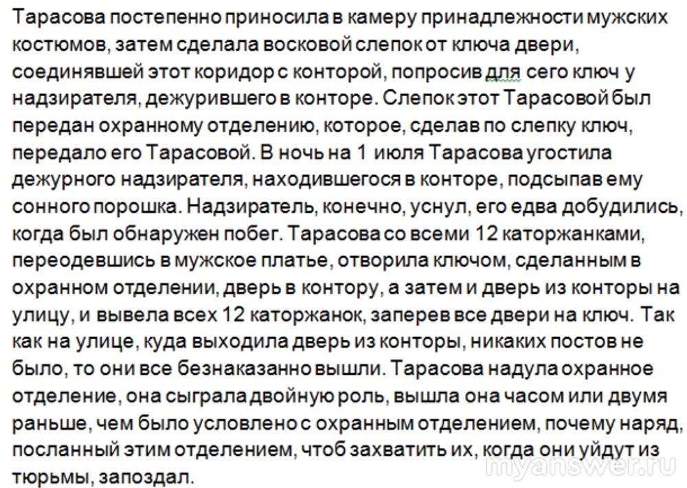 Известен, например, побег 13 каторжанок из Московской женской каторжной тюрьмы 1 июля 1909 г. Точнее каторжанок было двенадцать, тринадцатой было надзирательница Тарасова.