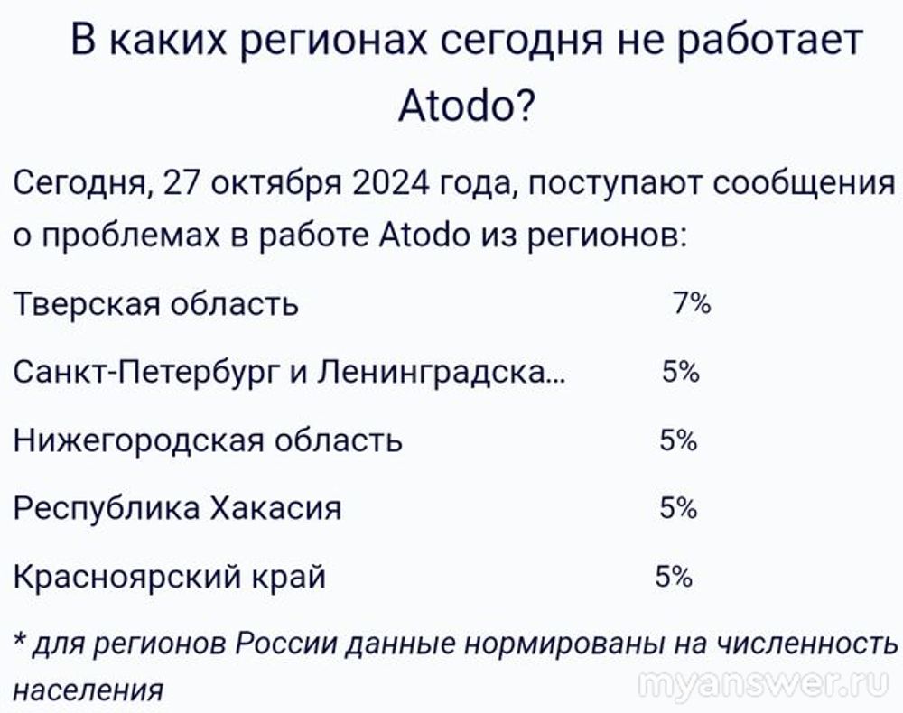 В основном жалобы о сбоях в работе платформы Atodo зафиксированы в Тверской области, Санкт-Петербурге.