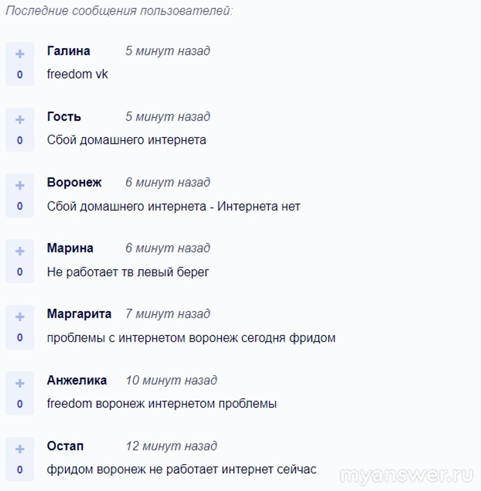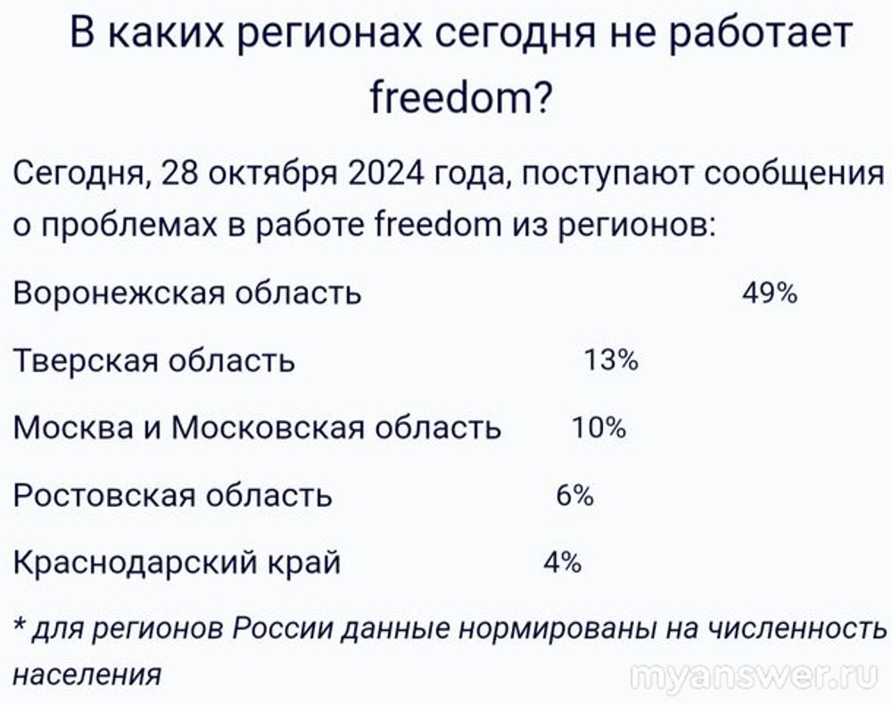 В основном с проблемами работы провайдера "Freedom" столкнулись жители Воронежской области, Тверской области, Москвы и Московской области.