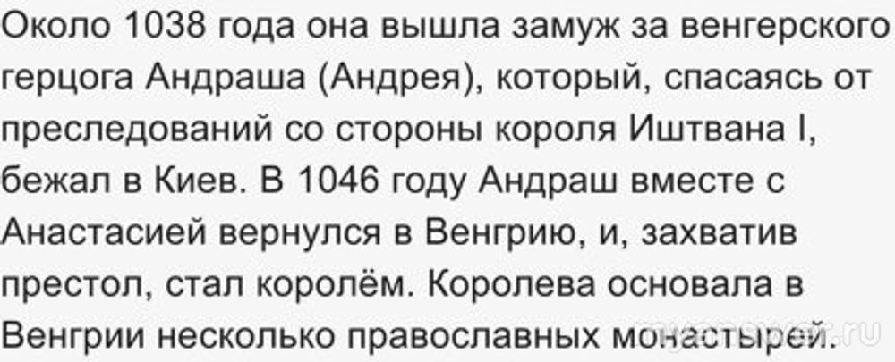 Князь Ярослав не зря удостоился звания Мудрый. Князь Новгородский и Киевский, он укреплял международные связи Руси на рубеже 10 и 11 веков. Он и отец и дед и дядя правителей Европы. Сам был женат на шведской принцессе Ингигерде. С ним сочли за честь породниться европейские королевские династии. Три дочери князя стали женами норвежского, венгерского и французского королей. Во Франции и Венгрии памятники установлены русским королевам. Старшая дочь Ярослава, ставшая королевой Венгрии одно время фактически правила страной, была регентом при малолетнем сыне . Ответ на вопрос - Анастасия. Слово из 9 букв.
